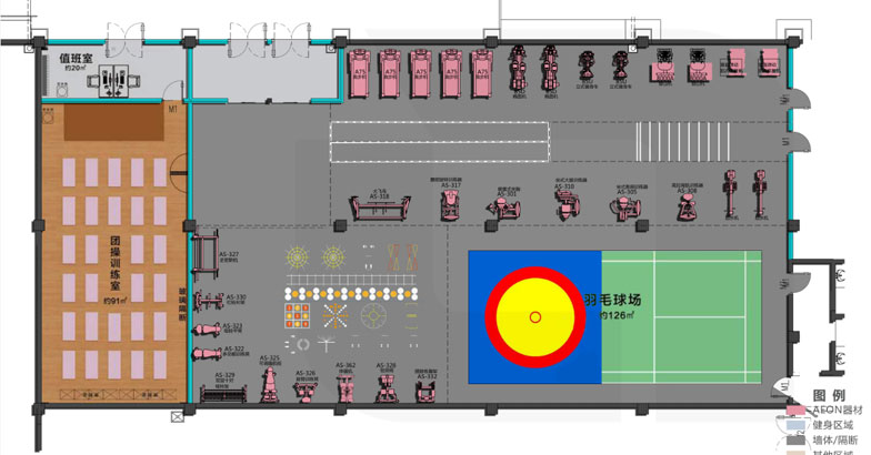 此方案主要由有氧器材和力量器材以及團(tuán)操訓(xùn)練室和羽毛球場(chǎng)地組成,適用于大型專業(yè)健身房、專業(yè)健身私教工作室、軍警消防健身房或企事業(yè)單位健身房。